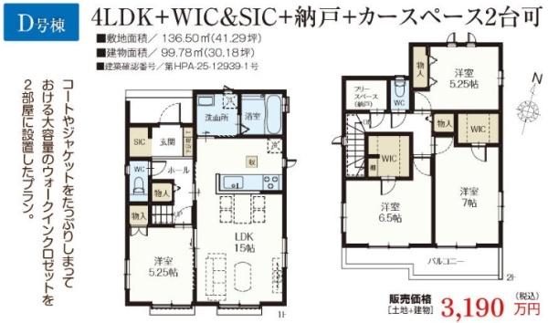 | 築年月 | 2026年2月築 | 間取り | 4LDK (LDK15/洋室5.25/洋室7/洋室6.5/洋室5.25) | ||