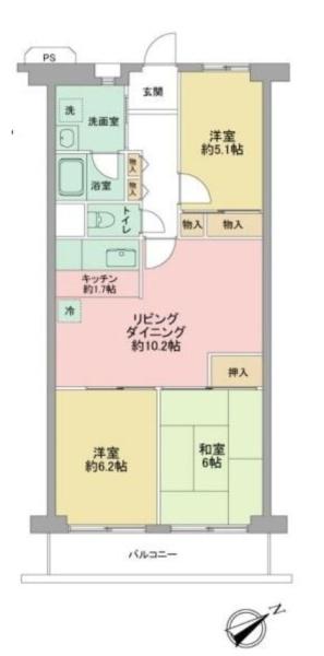 専有面積 | 67.2u | 間取り | 3LDK (LDK10.2/和室6/洋室6.2/洋室5.1) | ||
