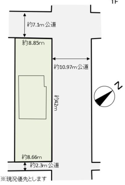 | 接道状況 | 接道: 東南 公道 道路幅: 2.3m 接道: 北西 公道 道路幅: 7.1m 接道: 北東 公道 |