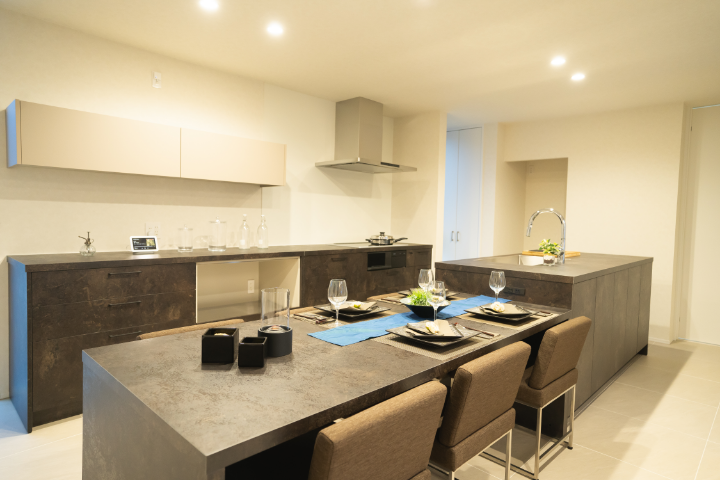設置し横並びでダイニングテーブルをつけることで会話を楽しめる