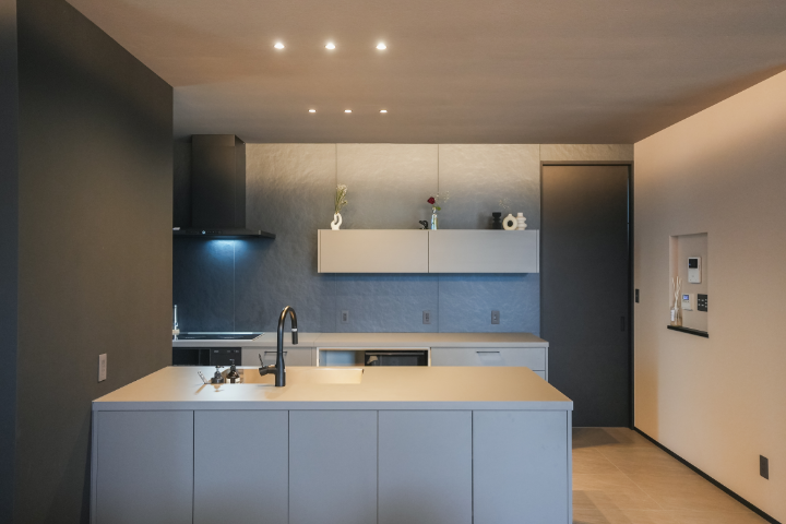 オニキスグレー色のキッチンが空間をより上品に引き立てるアクセントとなっている。