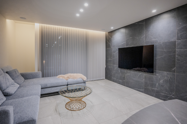 1Fのフロアー材と壁の一部は輸入タイルを活用しマテリアル(素材の質感)にも、
