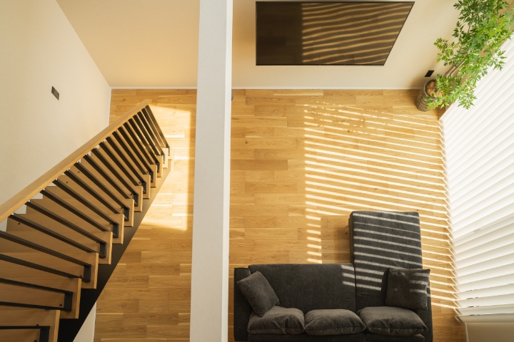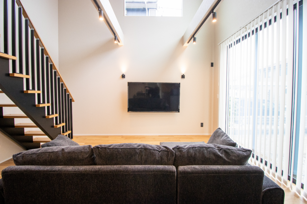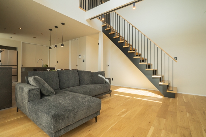 間取りは19.7帖のLDKに10帖の吹抜け、それに続くデザイン階段があり、