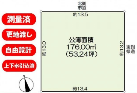 | 現況/引渡し | 更地/相談 | 接道状況 | 接道: 北東 公道 道路幅: 4m |