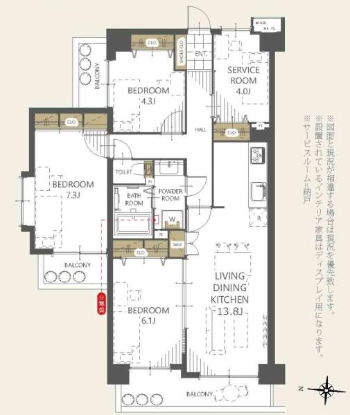 専有面積 80.7u 間取り 3SLDK (LDK13.8/洋室7.3/洋室6.1/洋室4.3/S4)